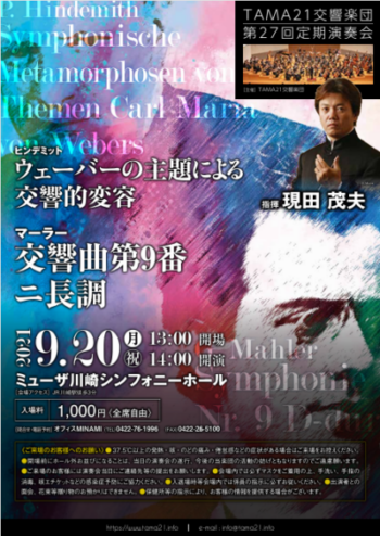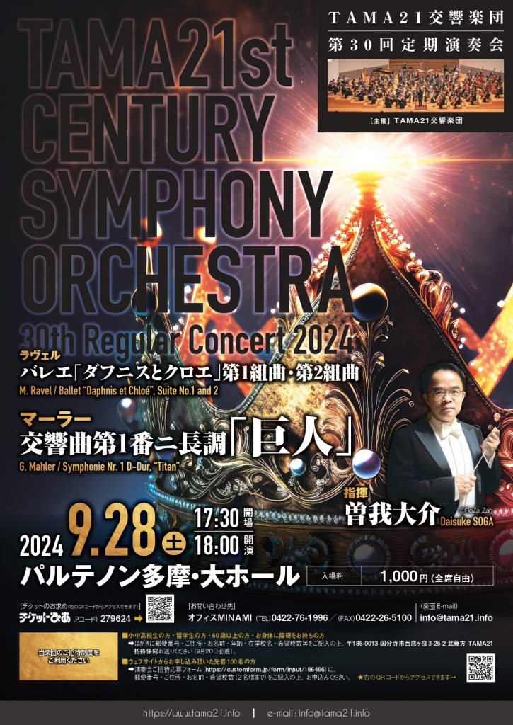 1993年、東京都の三多摩地域が神奈川県から東京府に移管されてから100年を記念し、多摩地域のさらなる発展を願うイベント「TAMAらいふ21」が開催されました。そのイベントの一環として結成された「TAMAらいふ21管弦楽団」を前身として翌年誕生したのがTAMA21交響楽団です。30余年前のTAMAらいふ21管弦楽団のメインプログラムはマーラーの第1交響曲であり、本曲を演奏するのはそれ以来になります。今回の指揮台には当楽団の定期演奏会にたびたび登場し、当楽団の歴史の一部を作ってきた曽我大介氏をお迎えし、この30年の成果と今後の期待を皆様にお届けします。
