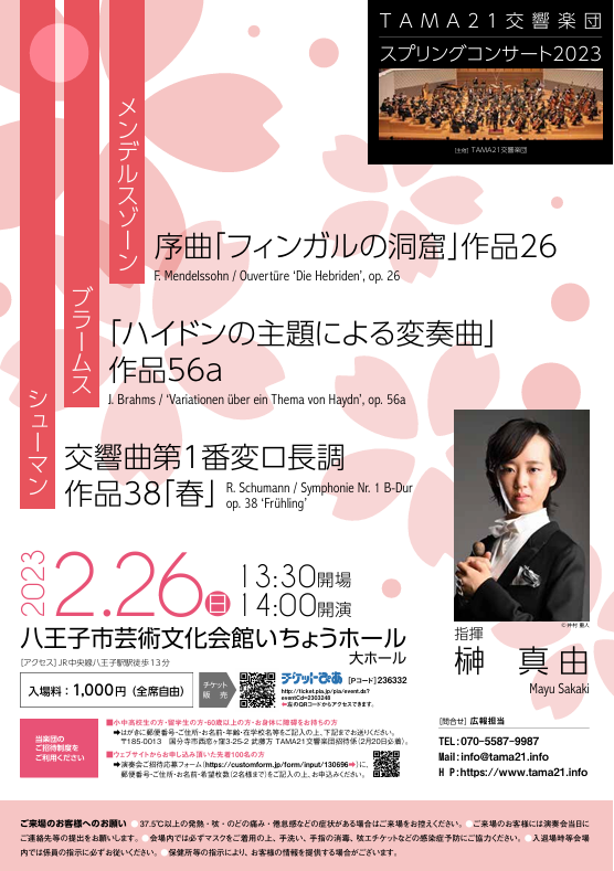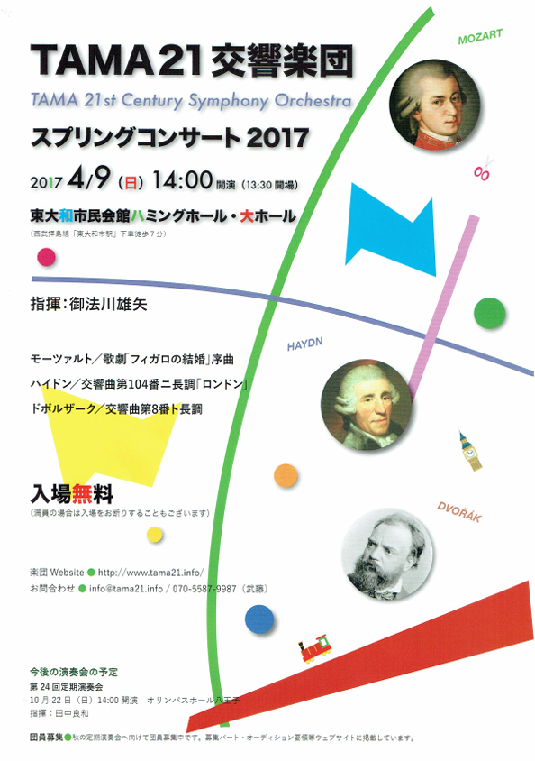 いわゆる「大曲」への挑戦を活動の中心としている当楽団にとって、アマチュアオーケストラで頻繁に演奏される「名曲」を取り上げる機会はなかなかありませんが、お客様からも団員からもこうした「名曲」に対する要望は多く、今回のスプリングコンサートのプログラムとなりました。今回NHK交響楽団ヴィオラ奏者で、指揮者としても活躍されている御法川雄矢氏を指揮にお迎えしました。名だたる指揮者と共演するだけでなく自らも式台で実践されている御法川氏の指揮の下、ふだん耳にすることの多い名曲を、どのようにTAMA21が演奏できるかご期待ください。