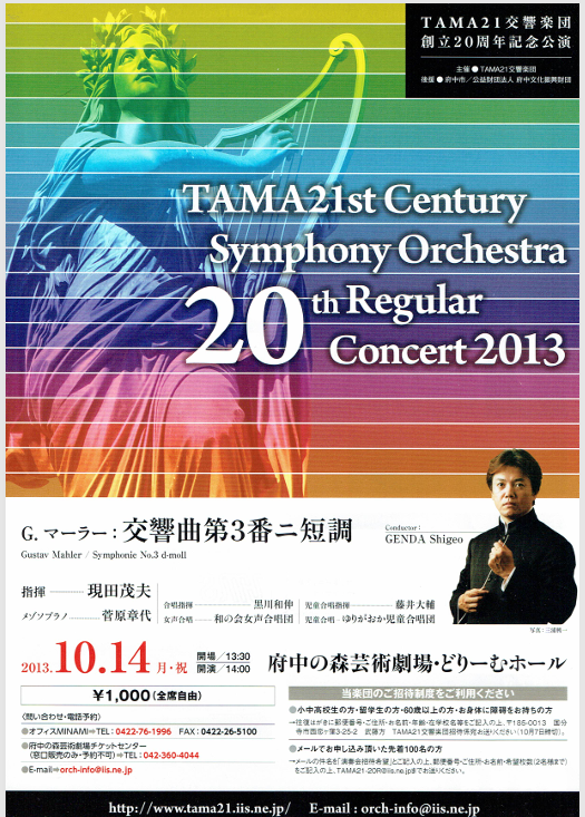 第3交響曲を作曲した湖畔の地を訪れた指揮者ワルターに対して「すべてを曲にしてしまったので君はこの風景を見るに及ばない」とマーラーは語ったと伝わりますが、単なる風景に留まらない森羅万象が独唱や児童合唱・女声合唱を伴うこの巨大な交響曲には描かれています。結成以来、多彩な指揮者、ソリスト、多摩各地の合唱団やバレエ団等様々な芸術家との共演を重ねてきた当楽団の20周年のすべてをこの交響曲の演奏を通じて私たちは表現できるでしょうか。